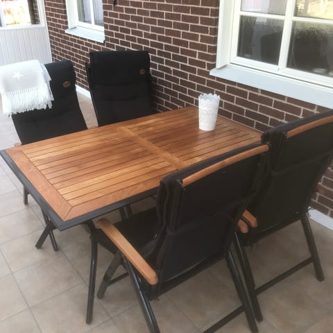 Säljer ett svart bord 90 x 205 cm i underhållsfritt material av modell MADERUP och tillhörande sex stapelbara stolar av modell NABBEN (med trädetaljer på armstöd). Möbelskydd i form av en stor presenning ingår.