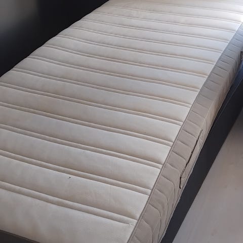 Hästens resårmadrass med ben, mjuk, bra skick men något fläckig. En tjock bäddmadrass har alltid legat på den, så fläckarna är troligtvis bara missfärgningar som kommer med tiden.
