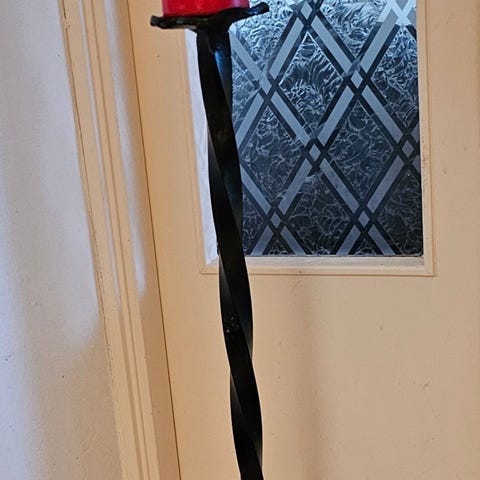 Golvljusstake av smidesjärn med en grenad ljushållare för fyra ljus. Den har även en inbyggd tidnings- eller flaskhållare.