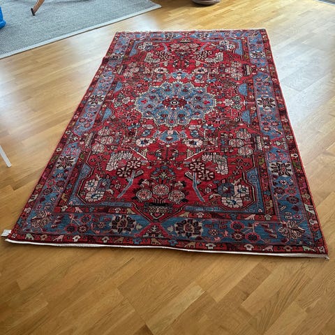 Matta Sumak från Dagestan 230 x 145 cm. Finns en skada i ena hörnet som syns mer på undersidan än ovansidan, se bilder. Finns och hämtas i Sigtuna.