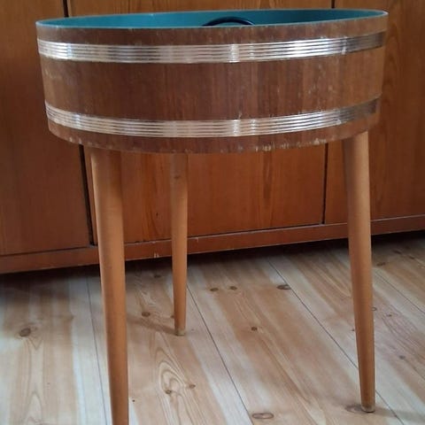 Hemslöjd. Träbehållare med handtag. Gjord 1972