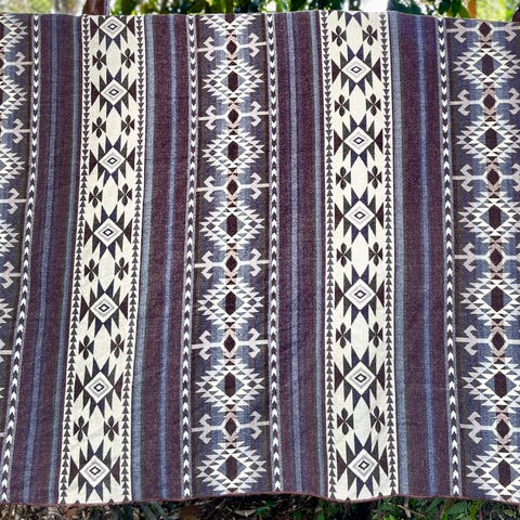 Blommönstrat beige mot svart botten. Bredd 140 cm. Längd 2,4 m. 150:-.