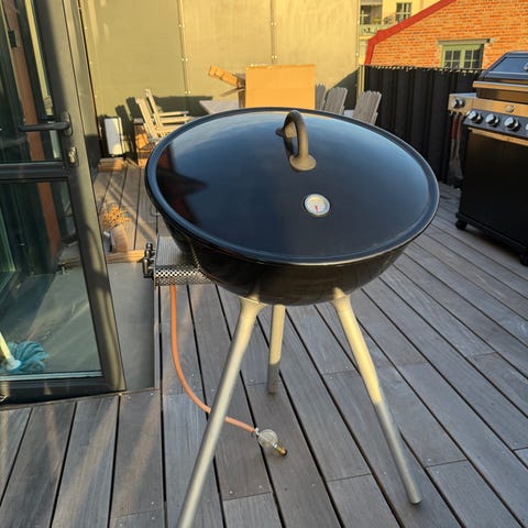 Snygg och praktisk kolgrill med lock och ventil för temperaturkontroll.