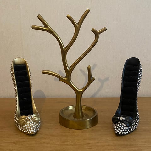 Den unika trädformen gör det enkelt att hänga upp ringar, medan skålen nedtill passar perfekt för armband, örhängen eller halsband.