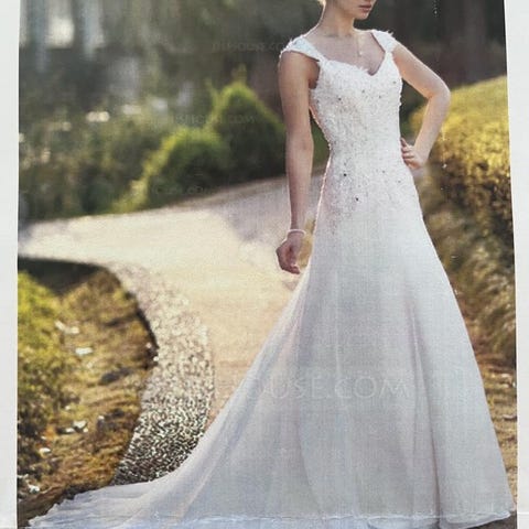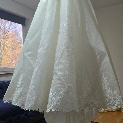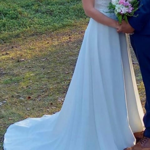 Ställbar brudklänning från 36-42 knytning i ryggen, underkjol, slöja och en ”bolero/kofta” medföljer. Kemtvättas efter bröllopet. Mycket fin finns fler bilder vid intresse finns på Gotland men kan skickas mot fraktkostnad