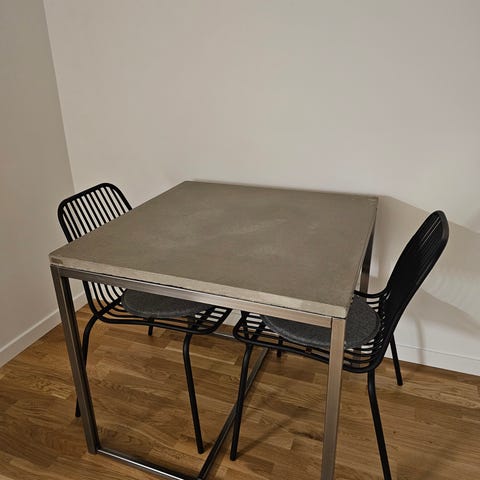 Säljer handgjort betongbord med underdel från ikea, två svarta pinnstolar inköpta för ett par år sen (2000 kr/st i inköp), rustik lampa inköpt samtidigt som stolarna (2500kr ny) med passande LED-lampa samt en skinnfotölj som passar bra i settet eller som separat läsfotölj/stol i bef skick.