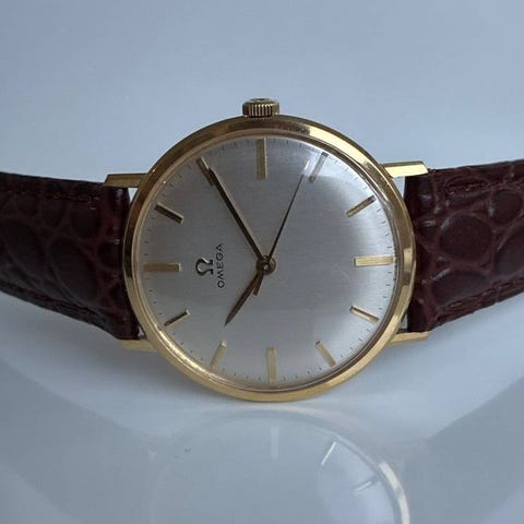 Omega Seamaster Automatic 1950/60 tal, med modifierad urtavla, dia 34 mm exkl krona, boett i 18 karat solid guld, champagnefärgad urtavla med svag lin-struktur, visare och index i guld, liten sek. visare