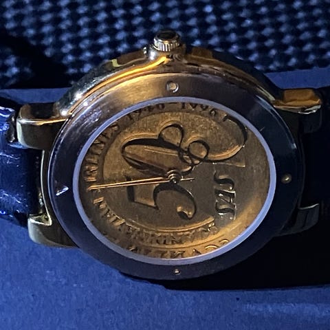 Dia. 36 mm exkl krona ( populär dia och något ovanlig) flerfärgad urtavla se bild), gedigen tidsenlig stål-länk, mycket svag knappt synbar gravyr på bakboett ”Uno”,