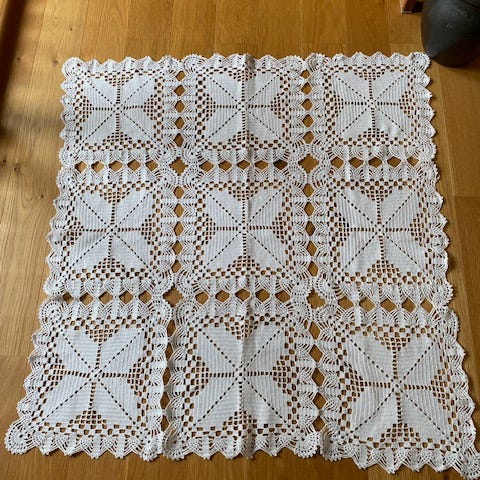 Sökord: vit, duk, dukning, vintage, retro, shabby chic, antik känsla, virkad, handarbete, fest, spets, kafferep, fika i bersån, romantisk.