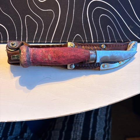 Trevlig fällkniv med handtag i trä.
