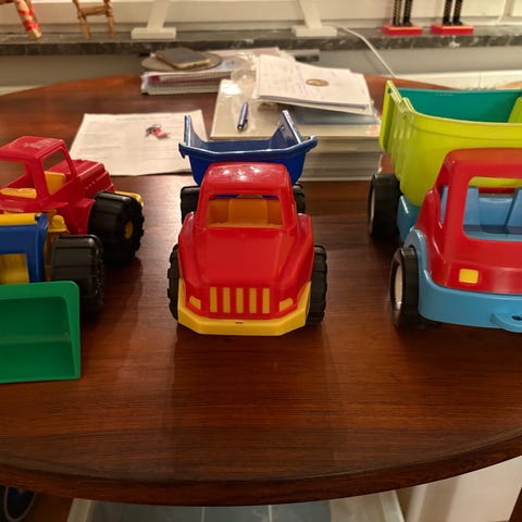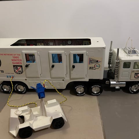 Vintage röd bärgningsbil och tankbil leksaksbilar
