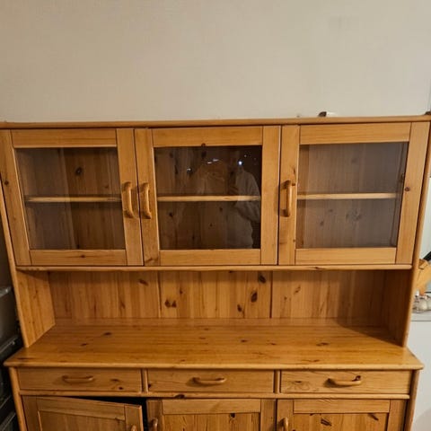 Vitrinskåp, hörn. Spegelskåp furu