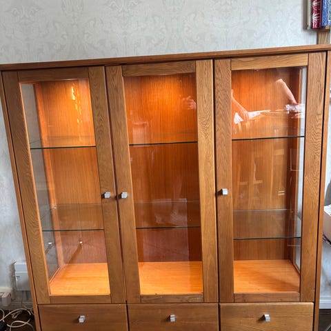 Skåp till kök el vardagsrum Vitrin samt en del m hyllplan o lådor Belysning finns i