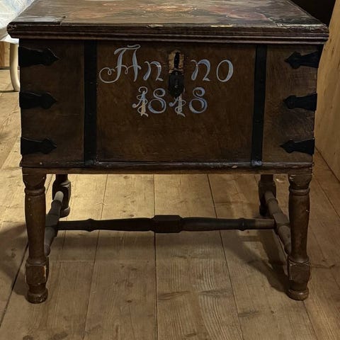 Fin svart kista, äldre ej fejkgammal. Finns i Bällstaberg nb. 86 lång, 54 bred, 62 hög
