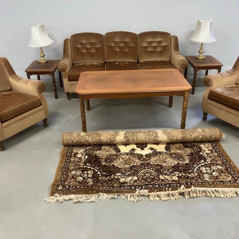 Soffgrupp med tillhörande bord i klassisk stil. Passar fint till stilmöbler.