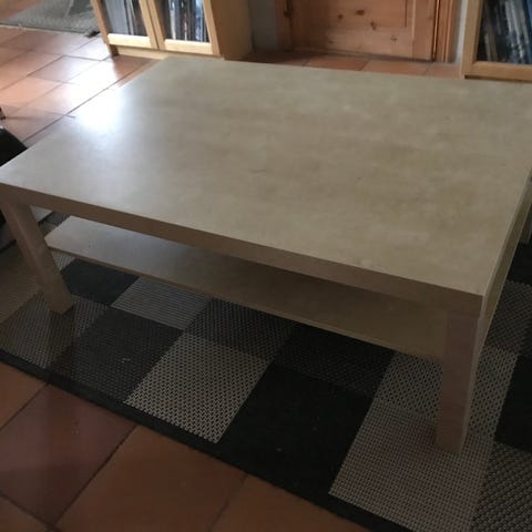 Brickbord i massivt trä, Stockholm Ikea. Bordet har hjul och en nedra skiva. Den övre skivan har en diameter på 60 cm och den undre 52 cm, bordets höjd med hjul är 61 cm från golvet till den övre skivan. .Den övre skivan kan lyftas av med hjälp av två handtag som är monterade utmed den yttre kanten, diametralt i förhållande till varandra.