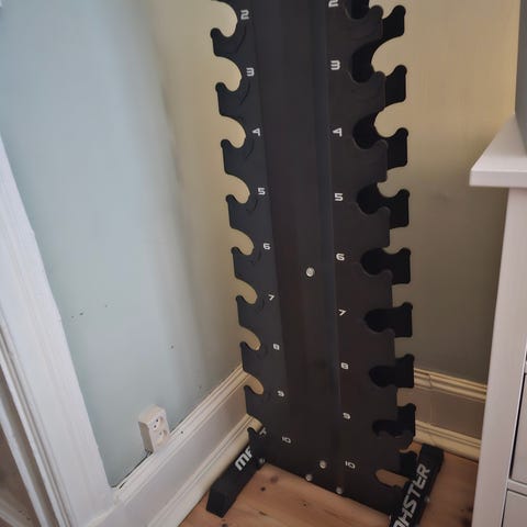 Gummerade HEX hantlar med ett fast ergonomiskt grepp. Totalt 7 par med gymhantlar inkl. stativ.