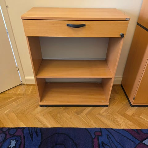 Fin vit metallhylla för förvaring av mindre saker, t ex i sovrum, hall eller barnrum. Mått 80 x 80 x 12 cm.