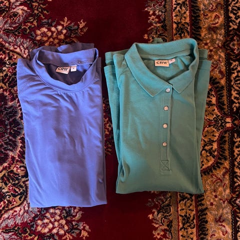 Vit pikétröja avsedd för ridning i storlek 146/152 för barn. Märket är Horze Crescendo. Tröjan har blåa detaljer på armarna och broderat silver på vänster sida bröstkorgen. Den har också fem knappar i form av silvriga strass-stenar. Sällan använd och i bra skick. Inga synliga tecken efter användning.