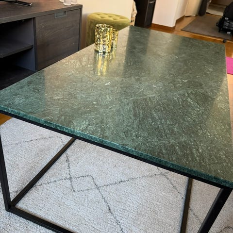 Säljer ett vackert bord med skiva i äkta grön marmor. Den naturliga ådringen och den djupa färgen ger en exklusiv känsla och gör varje bord unikt. Passar perfekt som soffbord eller sidobord och lyfter verkligen rummet med sin eleganta design.