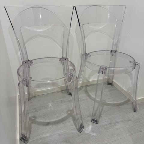 Säljer mina supersnygga transparenta akryl karmstolar i fransk stil med svart genomskinlig touch för endast 1300kr/styck.