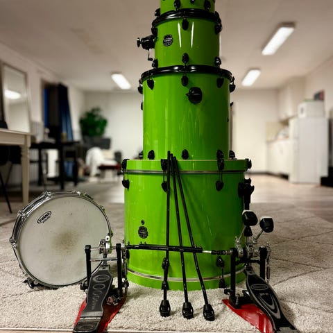 Mapex Meridian Black Obsidian, limited edition. Välljudande shellpack i gott skick i storlekarna 24"x14", 12"x08", 16"x16". Deep volcanic glass sparkle finish. Det finns lite dings här och där, men inget som är utmärkande. Powerful Maple/Birch hybrid shells, designed for rock drummers with deep tones and strong projection, featuring specific configurations like a 24" bass drum and black-finished interiors for enhanced resonance.
