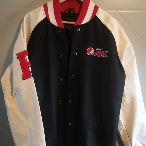 Stewart & Strauss jacka av premium kvalite, med ett stort rött "M" på bröstet. Jackan har vita ärmar och grå kropp, med röd- och vitrandiga muddar runt hals, ärmslut och nederkant. Jackan har tryckknappar fram och två fickor.