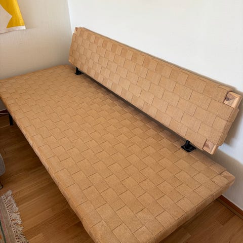 Går att ha i soffläge (bild 1-3) och dagbäddsläge (bild 4), där sittdelen blir helt plan. Ryggdynan är fast, sittdynan är lös/vändbar. Tyget är omklätt i modern tid, då till ett jättefint grått Hallingdal-tyg (ull). Skicket på möbeln är överlag fint.