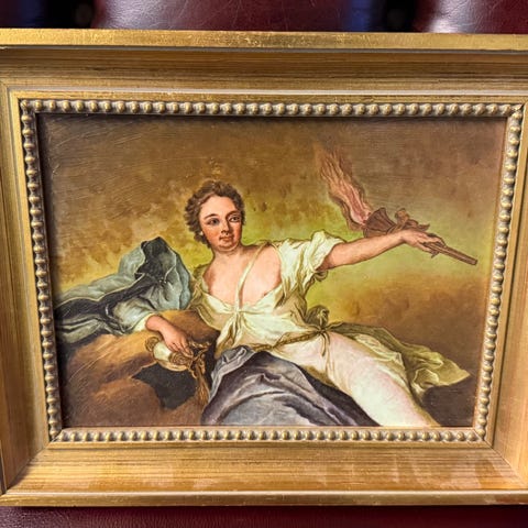 Oidentifierad oljemålning föreställande en stilleben med en tänd ljusstake, öppna böcker och frukt. Målningen är inramad i en dekorativ guldram. Motivets färger är varma med inslag av rött, brunt och gult.