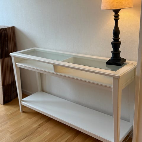 Sidobord i fint skick med glasdörrar, glashyllor.