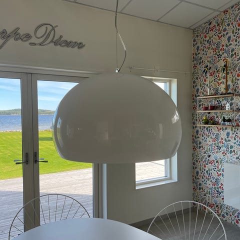 FL/Y taklampa från Kartell, designad av Ferruccio Laviani. En lampa som passar in i alla miljöer tack vare dess enkla form. Elsladden är i transparent plast och takkoppen är i matchande färg till lampskärmen. Lampan har en spricka på ovansidan som inte syns när lampan är upphängd, om den inte hänger väldigt lågt. Därav det låga priset