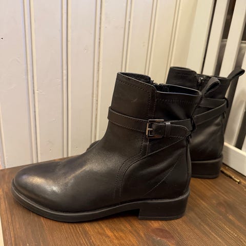 Ett par svarta kängor med klack säljs i nyskick för 200kr.