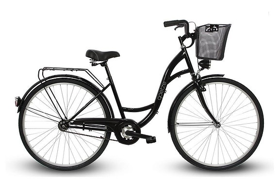 Fullt utrustad damcykel med extra lågt insteg. Med bred sadel, upphöjt styre och 47 mm breda 28 tum stora lättrullande däck. Shimano Nexus 3 växlar med fotbroms. Handbroms fram. Belysning ingår liksom skärmar, pakethållare, korg och kjolskydd.