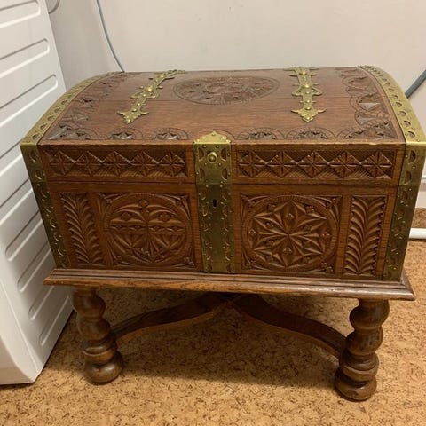Mycket ovanlig och rikt handskuren kista i massiv ek, troligen från Sydtyskland/Alpområdet, ca tidigt 1700-tal.