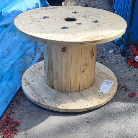 Bord av kabeltrumma bred 95 cm diameter och 49 cm hög. Underredet är i svart metall. Nypris 3900 kr