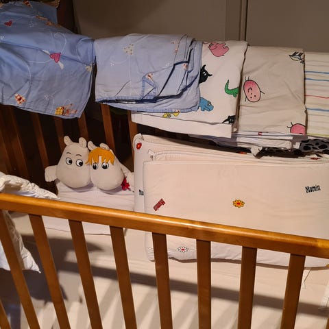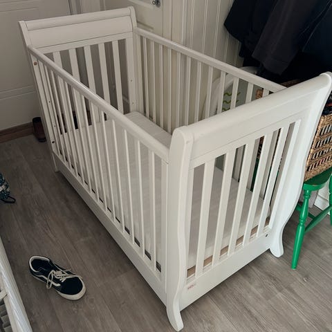 Troll barnsäng i vitt. Sängen är tillverkad av trä och är avsedd för barn. Den har en enkel design med spjälor runtom för säkerhet. Madrassen ingår och är i ljus färg, men visar tecken på slitage. Madrass överdrag har en reva råkade ta synder när jag tog bort för att tvätta den. Dotter har knappt sovit i den då hon sov bredvid mig.