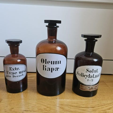 Vintage trälåda med gamla glasflaskor bl.a. Surte konserveringsburkar retro /antik i helt OK begagnat skick.