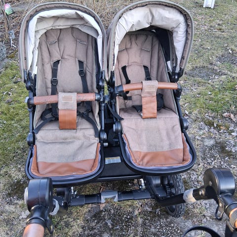 Säljer en praktisk och snygg syskonvagn i stilren brun/svart design – perfekt för dig med två små barn 👶👶