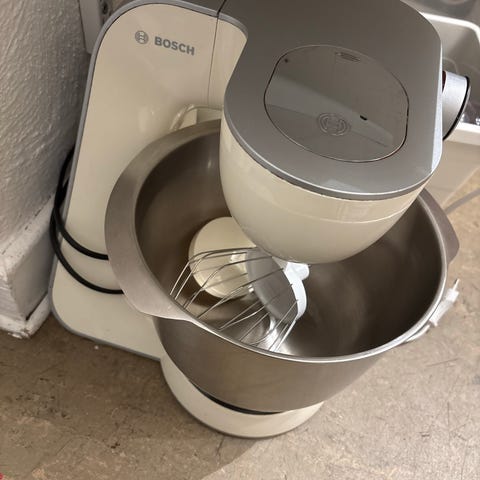 Bosch köksmaskin i vit färg med flera funktioner för matberedning. Passar för olika köksuppgifter och är lämplig för hemmabruk.