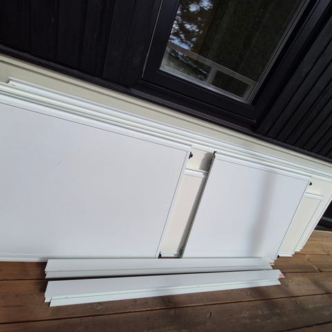 Säljer tre elfa skjutdörrar med skenor. Mått är 243x88 om man mäter från list till list på dörrarna. Sen mäter hjulen ca 3cm totalt. List i metall och skivan i trä.