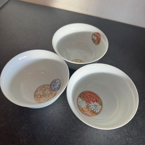 Ett set med 5 dessert assietter, 1 gräddkanna och en sockerskål från Kutani. Tillverkad i Japan, Kutani-regionen, känd för sin kvalitativa porslin.
