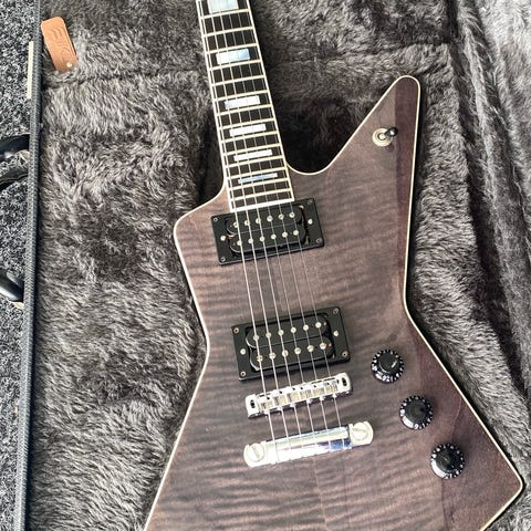 1. Elgitarr Gibson Explorer Vampire Blood Moon (2011). Elgitarren är installerad med Floyd Rose tremolo och straplock (remlås).