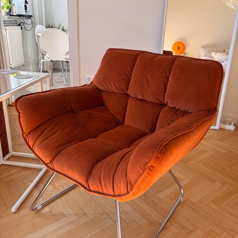 Säljer oanvänd fåtölj från Ellos (utan en skråma) då kontoret ska göras om till barnrum. Modell Karma i färgen Cremevit och valnöt.