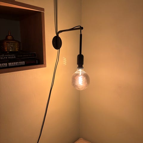 Vägglampa i svart metall med två lampor och en rektangulär bas. Går att dimra. Sladden behöver kopplas igen eftersom vi har haft den monterad genom en vägg. Finns I Nynäshamn men kan tas med till Sundbyberg.