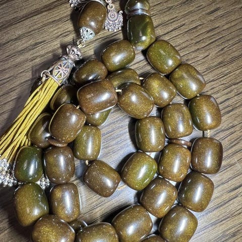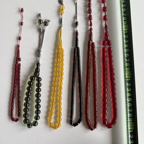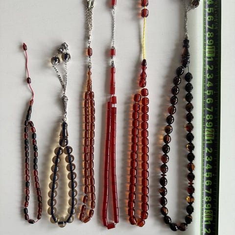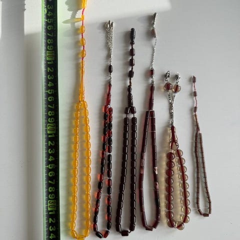 Mycket fint radband gjort av bärnsten säljs med fodral.