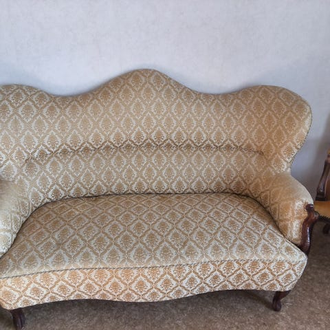 Slitage i form av små skador finns. På vissa ställen har dekorativa "sömmen" börjat släppa. Går troligtvis att limma tillbaka.