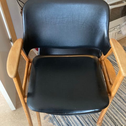 Designer: Bruno Liljefors Trä- svart läder Bredd ca 58cm ( armstöd till armstöd) Höjd ca 82cm ( ryggstöd) Höjd sits ca 46cm ( med dyna )