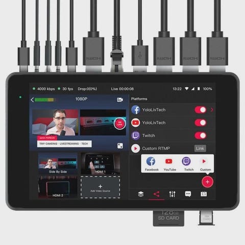Säljer min YoloBox Ultra för andra och större lösningar. NDI-Licens finns! 4K-streaming, ISO-inspelning 4 x HDMI & 2 x USB-ingångar + HDMI-utgång Lin In & Mic In + Ljudutgång Encoder, Monitor, Switcher och Recorder Horisontell och vertikal orientering 8-tums LCD-touchscreen NDI + SRT ingång och utgång USB-utgång för webbkamera + extern hårddisk Strömma via Ethernet, Wi-Fi, 4G LTE, USB SD-kortplats för inspelning Usb-c kabel medföljer för laddning av batteri i usb-c uttag endast för laddning av batteri.
