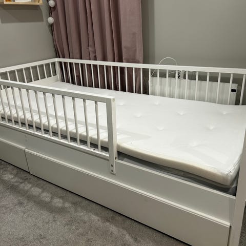 Flera märken/avskavd färg på sängramen. Se bilder. Madrassen har någon fläck, men tyget är avtagbart och går att tvätta.