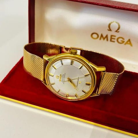 Omega Constellation ”Pie-Pan” Automatic 1960 tal, 18 karat roseguld i boetten, champagnefärgad urtavla med guldfärgade visare och index, dia 34 mm exkl omegakronan, bruttovikt 46,08 gram, omega original läderarmband i bra skick